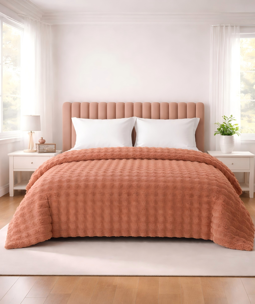 • Wyjątkowa miękkość: Jedna strona koca posiada gęste, puszyste włosie, które strukturą i delikatnością idealnie naśladuje naturalne futro królika.