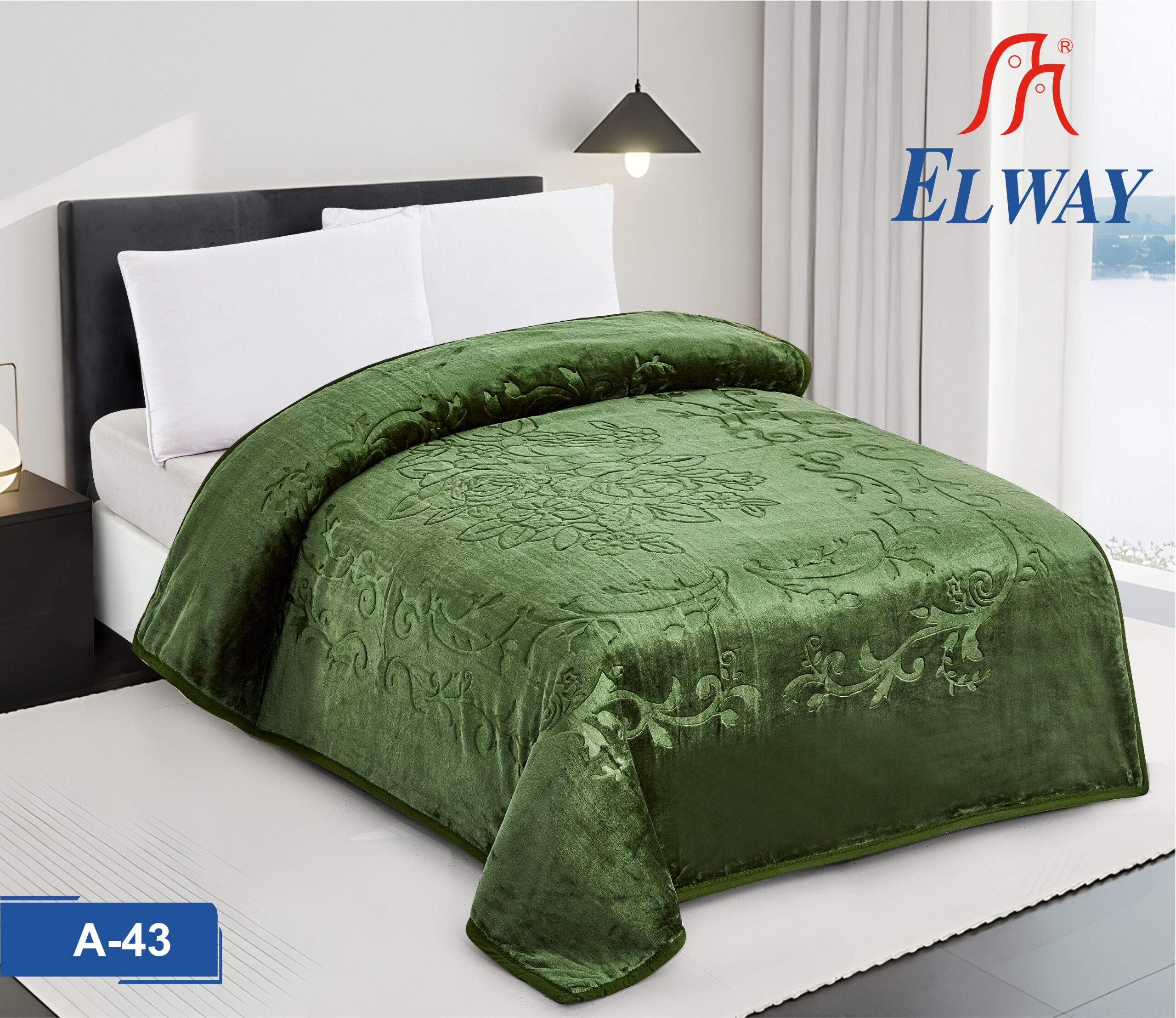 Ekskluzywny, gruby koc Elway 200×240 cm o wadze 3 kg to połączenie luksusowej miękkości akrylu z eleganckim, wytłaczanym motywem kwiatowym w kolorze butelkowej zieleni.